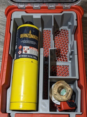 • Make sure your yellow/blue Bernzomatic cylinder is facing up (where the nozzle sits) and it will align with the notch cut-out in the top of the PACKOUT box. Gently lay it down onto the pre-installed foam padding.