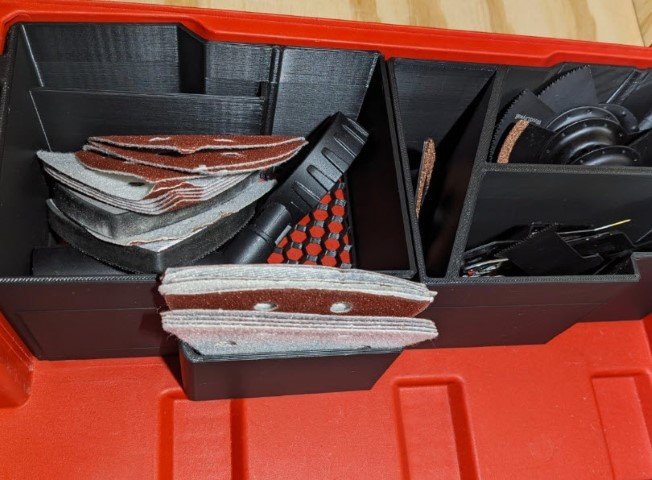 • The bottom insert has a side compartment for triangle shaped sanding disc/pads.